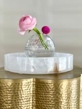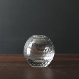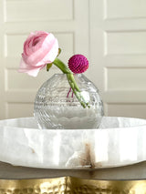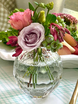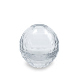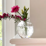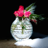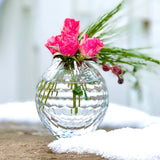 Crystal clear! This beautiful gleaming round glass bud vase is notable for its diamond like sparkle, substantial weight and faceted surface hand cut by skilled artisans. Catching light from every direction, just add a single bloom, berry branch or pine sprig for a stunning surprise on the mantel, windowsill, bedside or as part of your festive tablescapes.