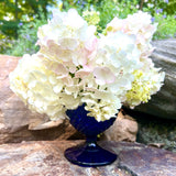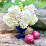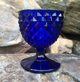 We fell instantly in love with the endless versatility of this shapely footed glass chalice. This unique glass vessel with intricate cut diamond texture in a rare vibrant cobalt blue color exhibits an exquisite sculptural aesthetic and infinite possibilities.