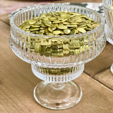 This style is aptly named Eidos by the vendor, from the Greek term meaning "form" or "essence." Luminous and elevated with a playful spirit, the Eidos footed glass barware is perfect for crudités, desserts, dipping sauces, individual charcuterie, signature cocktails and tabletop bouquets. Formed of pressed glass with heavy ribbed texture and weight, this versatile pedestal coupe glass (or bowl!) is substantial in hand, intended to be both admired and enjoyed.