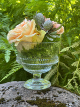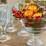 This is Kalos, from the Greek term meaning "beautiful to look at." Luminous and elevated with a playful spirit, the Kalos footed glass is perfect for crudités, desserts, dipping sauces, individual charcuterie, signature cocktails and tabletop bouquets. Formed of pressed glass with heavy ribbed texture and weight, this versatile pedestal coupe glass (or bowl!) is substantial in hand, intended to be both admired and enjoyed.