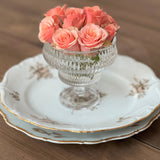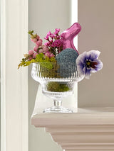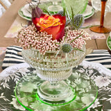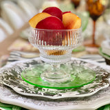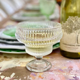 This style is aptly named Eidos by the vendor, from the Greek term meaning "form" or "essence." Luminous and elevated with a playful spirit, the Eidos footed glass barware is perfect for crudités, desserts, dipping sauces, individual charcuterie, signature cocktails and tabletop bouquets. Formed of pressed glass with heavy ribbed texture and weight, this versatile pedestal coupe glass (or bowl!) is substantial in hand, intended to be both admired and enjoyed.