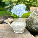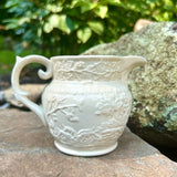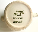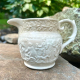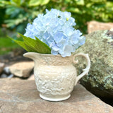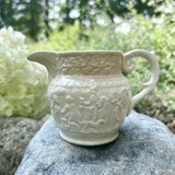 A classic vintage English ironstone pitcher in a highly textured and detailed raised hunt club scene image on all sides. Perfectly proportioned and sweetly scaled with a beautifully classic creamer shape, extended pouring spout and detailed handle. Ready to hold garden blooms or simply sit empty, awaiting admiration. A beautiful collectible piece with a glossy creamy ivory finish, this pitcher has some light crazing giving it a bit of a tea stained patina along upper rim. We exclaim it aged to perfection! A must have to add to your timeless neutrals collection, mixing beautifully with all styles and settings. Hunt Club by TG Green & Co. Made in England.