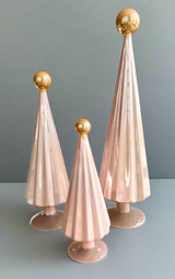 Treat yourself or someone you love to this luminous trio of light blush pink pleated glass trees adorned with gold ball tops. By designer Cody Foster, these beautiful shimmering statement trees formed of shapely geometric art glass will shine brightly on the mantel, windowsills, dining table and beyond. And they will keep the enchantment of winter going long after the holidays are over. Heirloom worthy.
