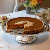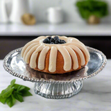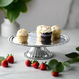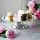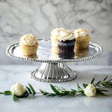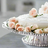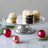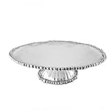 This stunning polished metal Pearl Pedestal Platter features a beaded detail design and lush polished finish that will elevate any culinary presentation. Its beauty is matched only by its functionality, delivered in an oven annd freezer friendly aluminum alloy.