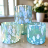 A beautiful votive holder set in an exquisite white mottled glass pattern on a unique aqua blue ground. Deck your halls, tables, mantels and beyond. Formed of art glass, these shimmering beauties will simply delight for any occasion during the holiday season and beyond. We love these speckled glass votive holders at the Thanksgiving table too! This aqua blue is especially stunning and just a bit surprising when paired with seasonal hues. No two are exactly alike. Artistry at home. By designer Cody Foster.