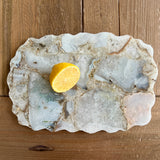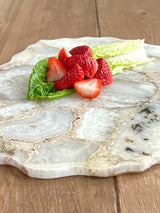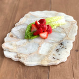 An exquisite uniquely shaped platter in genuine white agate. A quick refresh for tired spaces, this platter creates a stunning focal point wherever it is placed. Embodying both contemporary and traditional European aesthetics, this elegant agate platter is at home anywhere. Captivating in its simplistic organic beauty, this agate artisan platter is a finely crafted treasure not to be missed. Each piece is unique in color and composition, reflecting the intrinsic character and beauty of this natural stone. Each luminous serving surface is polished to perfection. Also makes a wonderful gift!