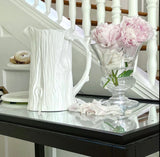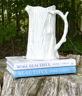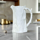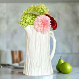 A classic faux-bois white pitcher to have and hold onto by luxury goods maker, Blue Pheasant. Perfectly proportioned and generously scaled featuring a beautiful organic shape resembling a tree trunk with outstanding lifelike details and intricacies, this beautiful white pitcher vase is at home in traditional and contemporary settings alike. Ready to hold garden blooms or simply sit empty awaiting admiration, this textured white pitcher also boasts a pouring spout and sturdy handle. This pitcher’s intriguing shape widens subtly at the base and top rim. A perfect complement to your timeless whites collection and a beautiful choice for special al fresco dining, this pitcher feels both nostalgic and modem at the same time. Made of high quality matte white porcelain.