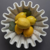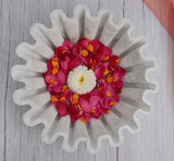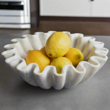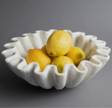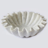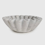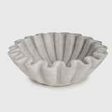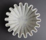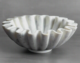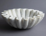 This exceptional authentic carved marble bowl features a lotus flower shape with ribbed detailing and a heavyweight composition consistent with the artistry of natural stone. Note its beautifully varied hues with variations in movement, veining and inclusions which speak to the piece’s organic form and authenticity. No two are alike. An impressive artful statement maker on the coffee table, in the bath, holding soaps, jewelry and beyond. This sophisticated marble piece is designed to work effortlessly with everything you own, lending a timeless organic appeal to your most coveted spaces.