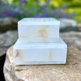 Ideally sized for vanities, bedside tables, office desks and beyond, these exquisite covered boxes crafted from genuine alabaster are natural beauties. A hand polished finish accentuates their natural variations, making each box artistically unique. A well fitting lid conceals contents in style. Felted protective pads on bottom. Artistry at home.