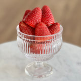 Meet Skopeo, from the Greek term meaning "to fix one's eyes upon." Luminous and elevated with a playful spirit, the Skopeo footed glass is perfect for crudités, desserts, dipping sauces, individual charcuterie, signature cocktails and tabletop bouquets. Formed of pressed glass with heavy ribbed texture and weight, this versatile pedestal coupe glass (or bowl!) is substantial in hand, intended to be both admired and enjoyed.