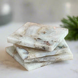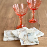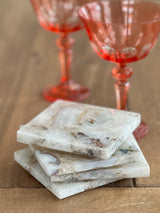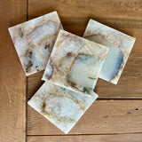 An exquisite set of four square coasters in genuine white agate. A quick refresh for tired spaces, this set of coasters instantly elevates the coffee table, bar cart and beyond. Both functional and beautiful, these coasters create a stunning focal point wherever they are placed. Embodying both contemporary and traditional European aesthetics, these elegant white agate coasters are at home anywhere. Captivating in their simplistic organic beauty, each coaster is unique in color and composition, reflecting the intrinsic character of this natural stone. Surfaces are polished to perfection. Makes a wonderful gift!