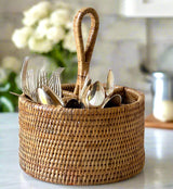 This generously sized popular rattan handmade utensil caddy is an entertaining essential and the only cutlery holder you will ever need! An endlessly versatile beauty complete with four divided compartments, durable tightly woven construction and a sturdy loop handle. This generously sized and masterfully created rattan handled caddy makes serving a breeze!