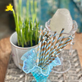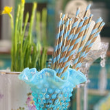 A pretty and easy way to garnish a cocktail or glass of lemonade, these striped paper straws in soft sky blue and glimmering metallic gold add interest to any beverage. The festive striped design complements all our paper plates and pairs effortlessly with any tabletop. A must at your next brunch or baby shower!