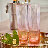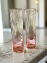 This fresh stemless take on the traditional champagne flute features a tall slender columnar silhouette. Easy to grip in textured ribbed glass, this sturdy pressed glass barware is as beautiful and luminous as it is versatile. We also love this stemless champagne glass for serving up lemonades and signature cocktails. A vintage inspired barware set to be both admired and enjoyed with a subtle blush pink hue that imparts a sweet sophistication to your cocktails in any season.