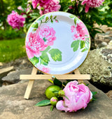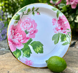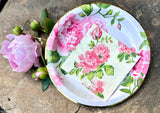These vintage inspired pink floral plates make a sophisticated addition to your easy elegant summer tabletop. With a classic large scale chintz floral pattern and gold foil accents these plates will enhance any table with garden party vibes and disposable ease. A beautifully versatile style that works well in endless settings. Try with our coordinating floral napkins and green striped table runner! Also perfect with our gold disposable cutlery. By My Mind’s Eye.