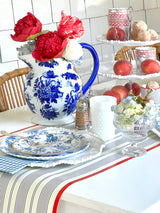 Make it fun and festive in an instant with this classic Americana paper table runner in handsome blue and creamy white with red edge. Just enough color and pattern to set the stage for a fresh tabletop set up on the porch, patio or picnic table, this paper runner for the table will instantly transform your tablescape. Sophisticated summer vibes with disposable ease. Try with these white melamine plates. We suggest using a paper table runner that is at least 12” longer than the table. By My Mind’s Eye.
