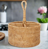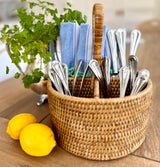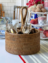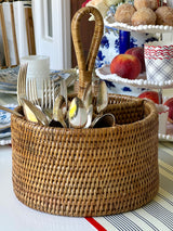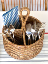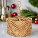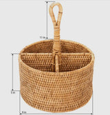 This generously sized popular rattan handmade utensil caddy is an entertaining essential and the only cutlery holder you will ever need! An endlessly versatile beauty complete with four divided compartments, durable tightly woven construction and a sturdy loop handle. This generously sized and masterfully created rattan handled caddy makes serving a breeze!