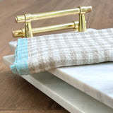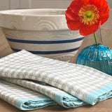 We fell instantly for these robust linen gingham kitchen towels with their beautifully soft neutral color and contrasting edge detail in a seaside aqua hue. These luxurious towels deliver a fresh and invigorating boost to any kitchen. Crafted from a weighty full-bodied linen, these striking tea towels are both pleasing to the eye and indulgent to the touch.