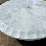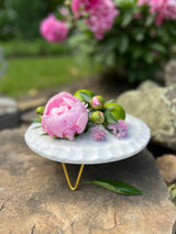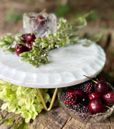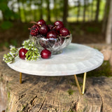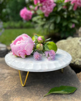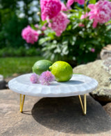 Put it on a pedestal! This beautiful handcrafted footed marble serving plate, with sculpted edges reminiscent of a pie crust, features a thick and substantial marble surface resting atop sculptural hairpin gold legs. Perfect for presenting eclairs, cupcakes, tarts and pastries, adding height and interest to any table.
