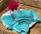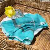 The easygoing stonewashed linen napkin collection by Caravan Home delivers full-bodied, richly draping squares in a fresh design boasting a simple contrasting stripe and edge treatment. With a French bistro vibe, these simply elegant aqua blue napkins with charcoal grey and white accents will complete your table in any season with a nod to understated luxury and classic continental style.
