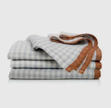 We fell instantly for these ultra luxurious premium robust linen gingham napkins with their beautifully soft modern blue gray neutral color way and contrasting edge detail in a cognac hue. Crafted from a weighty full-bodied linen, these luxuriously lofty napkins by Caravan deliver a fresh and comfortably welcoming vibe to any table setting. Pleasing to the eye and indulgent to the touch!