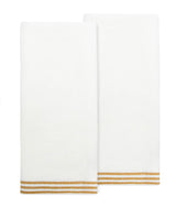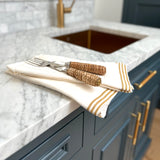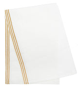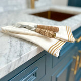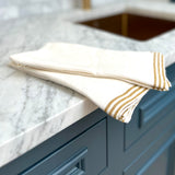 We fell instantly with these exquisite Alsace kitchen towels with their classic white color and contrasting striped detail in mustard yellow. A beautiful boost to any kitchen. Crafted from a weighty linen, these elegant tea towels are both pleasing to the eye and indulgent to the touch. Classic French country charm. Featuring a classic three stripe border, these bistro inspired towels are a fresh take on the classic.