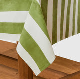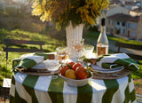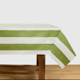 Heavyweight and substantial, this beautiful summery green and white striped cloth is a timeless summer classic. Handcrafted with care in a cabana striped pattern, this tablecloth will soon become an entertaining essential. The one you will reach for over and over again, year after year. With wide striped patterning, this cloth boasts classic European countryside styling, creating an instantly inspired backdrop for all your summer gatherings. Generously sized, this French inspired textile also boasts beautiful body, texture and structure.