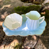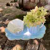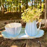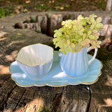 Just wow! In an exquisite sky blue hue, this vintage English china creamer, sugar and tray set is a beautiful find. A treasure not to be missed! The set’s stunning, captivating inimitable soft blue color will be the talk of the table at every meal you serve. We especially love at the garden party or Mother’s Day tea. Gold tipped scallop edge detailing with white interior. Old Royal bone china made in England.