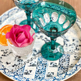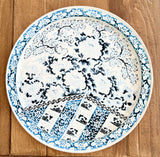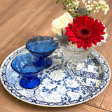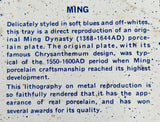 A beautiful serving tray for summertime beverages and beyond, this vintage blue and white lithograph on metal reproduction Ming tray is a versatile beauty. It’s stunning chrysanthemum pattern make it ideally suited for displaying on the rear face of your open shelving too. Back is stamped as shown.