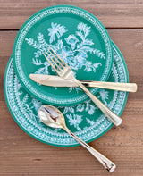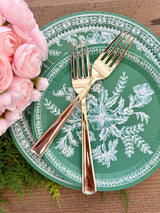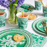 Bring the spirit of the French countryside to your next gathering with our floral toile dessert plates in a new rich emerald green and white palette. A beautiful essential for creating lush garden tabletop vibes with disposable ease in any season. Ideally sized for small bites and desserts. See our coordinating dinner plate and napkins too. Also available in pink and blue. By luxury paper goods maker, Coterie.