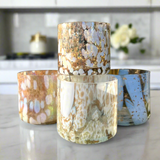 A beautiful designer votive set in four assorted hues and patterns of exquisite white and gold mottled glass to deck your halls, tables, mantels and beyond. This set is a bit eclectic, with each of the four unique vessels exhibiting its own artistic personality. One of the votives in the set even has a unique gold mercury glass lining inside as shown. When grouped together these four vessels deliver an inimitable sophisticated artisan appeal. By designer Cody Foster. Formed of beautiful art glass, these shimmering speckled beauties will simply delight for any occasion. Also available in aqua and gold.