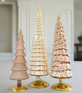 Treat yourself or someone you love to this statement sized trio of luminous neutral hue art glass trees by designer Cody Foster. Beautifully formed of shapely blown glass, these shimmering beauties will captivate on the mantel, dining table, entry table and beyond. Statement makers in every way, this trio creates a simply stunning focal point wherever it is placed, working well beyond the holiday season. Mix a dash of this sophisticated neutrals into your holiday palette. So versatile, we love for Thanksgiving through Valentine’s Day! A most intriguing hue, this color way includes warm soft coppery and gold undertones. Perfect in settings with warm woods and warm metal accents. A perfect gift for the home curator.