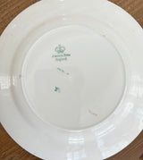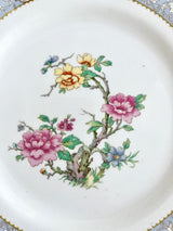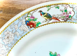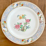 A soft blue hue, delicate pink and yellow florals and aviary themed detailing ate featured in this Asian inspired vintage china plate delivering classic elegance and fresh style to your Spring tablescape and beyond, Makes a pretty backdrop for a small presentation of culinary treats. Made in Englamd by Johnson Brothers. Rear is stamped as shown.